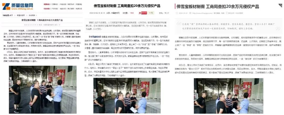經(jīng)核實(shí),“雪寶小王子”、“楿港雪寶”、“雪寶木精靈”等板材不但在名稱(chēng)和商標(biāo)上抄襲雪寶品牌,而且在原材料、膠水、甲醛含量等多項(xiàng)核心指標(biāo)上都與正規(guī)雪寶品牌所售板材相距甚遠(yuǎn),極大影響了雪寶品牌的聲譽(yù),損害了消費(fèi)者的利益,雪寶公司請(qǐng)求工商部門(mén)查處。
