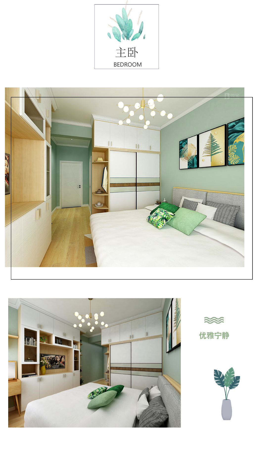 薄荷綠的點綴設(shè)計,能為臥室營造一個安靜的休息環(huán)境,仿佛能時刻感受到大自然的和煦微風和溫暖陽光,床頭對面白色柜子的設(shè)計,既擴大儲存空間,又增添一抹優(yōu)雅!