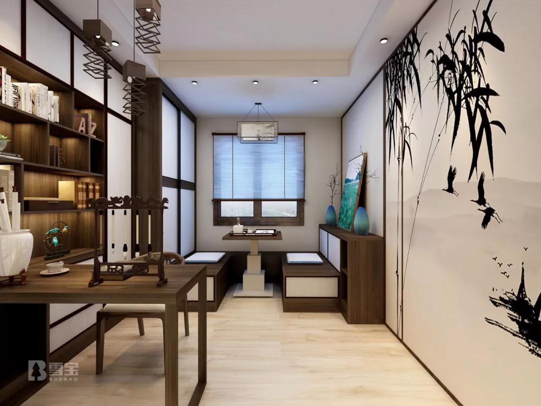 墻面上運(yùn)用墨竹裝飾,與全屋整體風(fēng)格相互襯托和統(tǒng)一。墨竹,代表了男主人堅(jiān)韌的性格和不屈的氣節(jié)。在榻榻米升降臺(tái)酌一壺香茗,與三兩好友在一方文墨書香的書室里品茗閱讀,當(dāng)屬生活一大趣事。青色瓷瓶插上幾許枯枝,一幅油畫裝飾,令空間生機(jī)勃勃。
