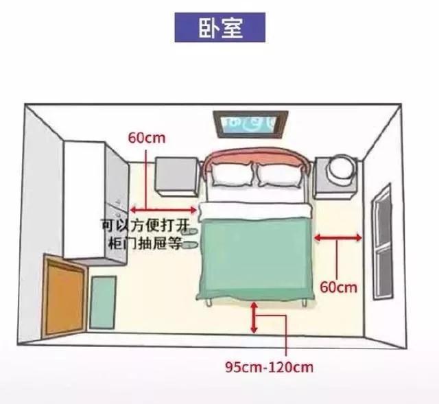 小戶型的臥室不帶衛(wèi)生間,那么衣柜和床的距離不能小于60厘米,床到窗戶之間不小于60厘米。
