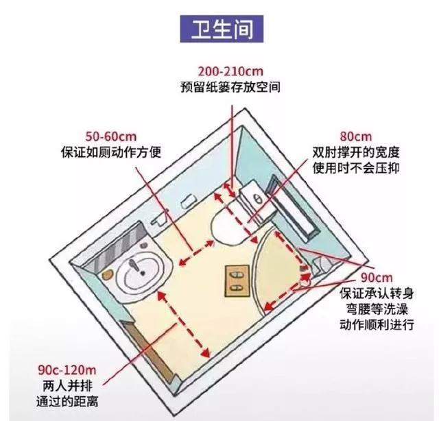 衛(wèi)生間最好做干濕分離,入住后使用能少去很多麻煩,一般家里用淋浴就好了。馬桶前方留出50-60厘米的空間,左右留出空間不小于20厘米。