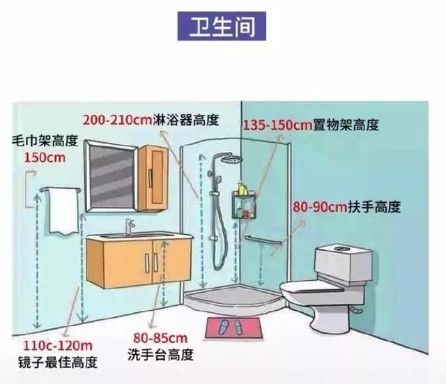 淋浴頭的高度在2m左右,淋浴室最好裝一個扶手,使用起來比較方便,也可以充當置物架。