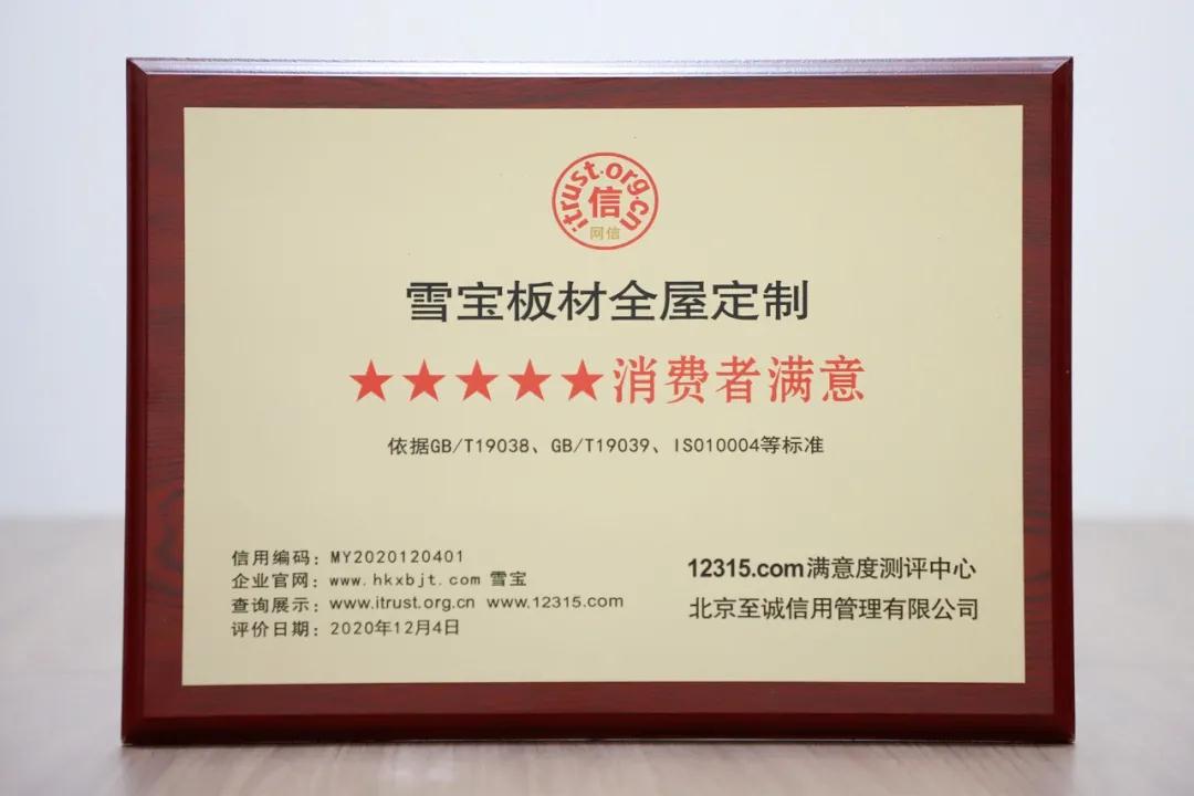 中國板材國家品牌「雪寶」獲得由權(quán)威第三方評(píng)價(jià)機(jī)構(gòu)iTrust互聯(lián)網(wǎng)信用評(píng)價(jià)中心、12345.com滿意度測評(píng)中心共同授予的“客戶滿意度滿意指數(shù)證書”,獲評(píng)為最高滿意等級(jí)5星級(jí)優(yōu)秀企業(yè)。此項(xiàng)星級(jí)認(rèn)證是滿意度指數(shù)評(píng)級(jí)標(biāo)準(zhǔn)需達(dá)到90%及以上才能獲得的資質(zhì),也是滿意度指數(shù)測評(píng)中可獲得的最高級(jí)別。