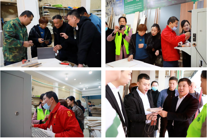 雪寶優(yōu)裝基于“前店后廠”模式,擁有自己的小型加工廠,標(biāo)配開(kāi)料機(jī)、封邊機(jī)以及其他加工設(shè)備。參會(huì)經(jīng)銷商在雪寶優(yōu)裝平江店加工廠參觀學(xué)習(xí),現(xiàn)場(chǎng)觀摩工人進(jìn)行“二合一工藝”安裝實(shí)操及其他生產(chǎn)加工工序。
