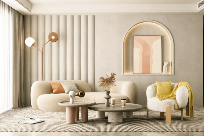弧形設(shè)計(jì)是奶油色家居常見的裝飾元素,如拱門造型、圓弧窗口、半圓弧壁龕等等,直線被柔美曲率中和,弱化了空間的生硬和疏離感。