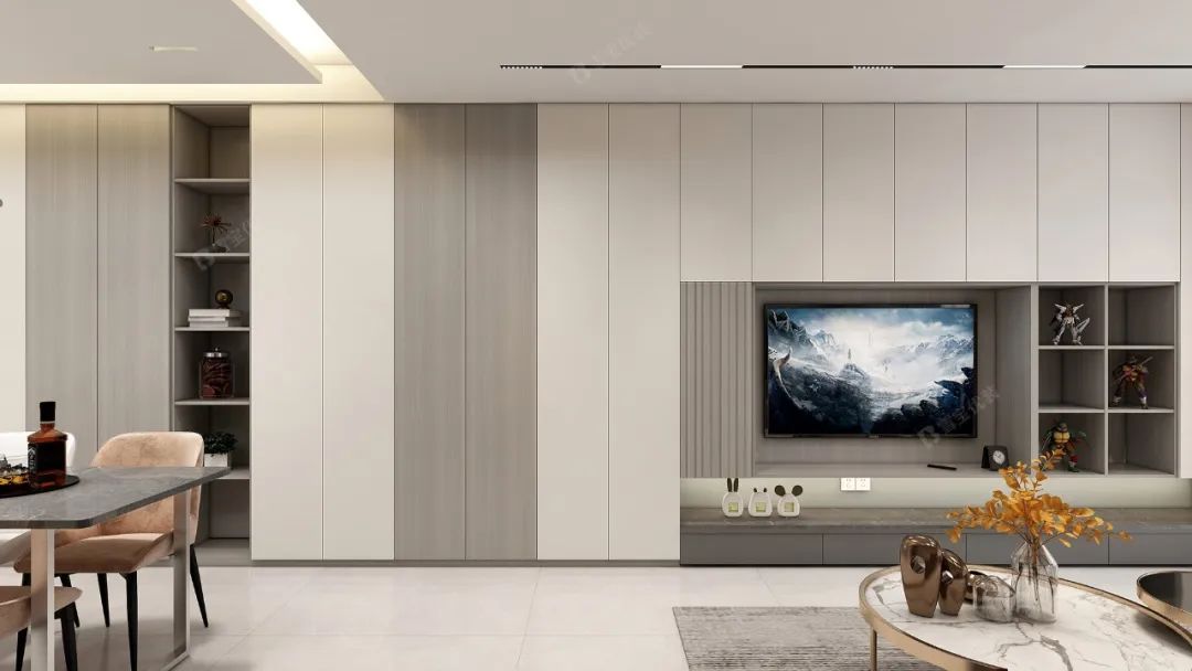 整墻電視柜,墻柜一體,外表簡約時(shí)尚,自然素雅,無拉手設(shè)計(jì)讓整個(gè)柜體更為利落清爽。