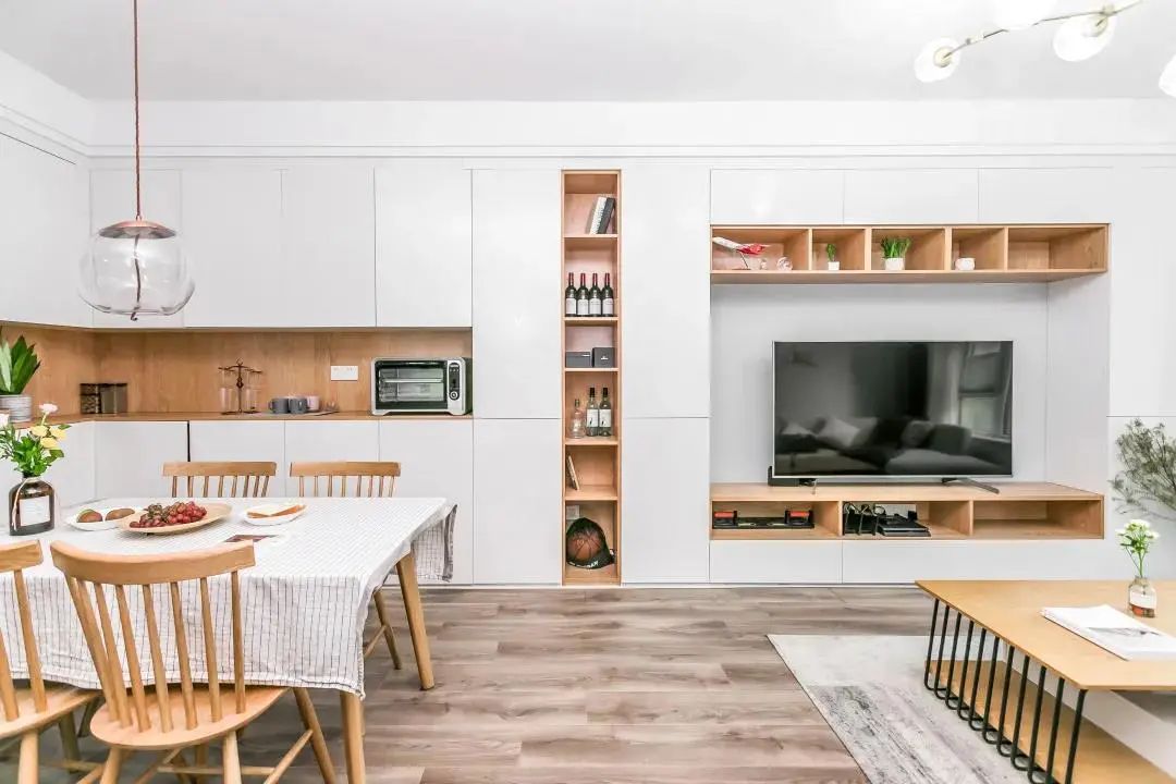 電視柜+餐邊柜整墻定制,這種設(shè)計(jì)適用于一體式的客餐廳,不僅能提升客餐廳的儲物能力,還能拉長客廳視覺,讓小空間更顯大。