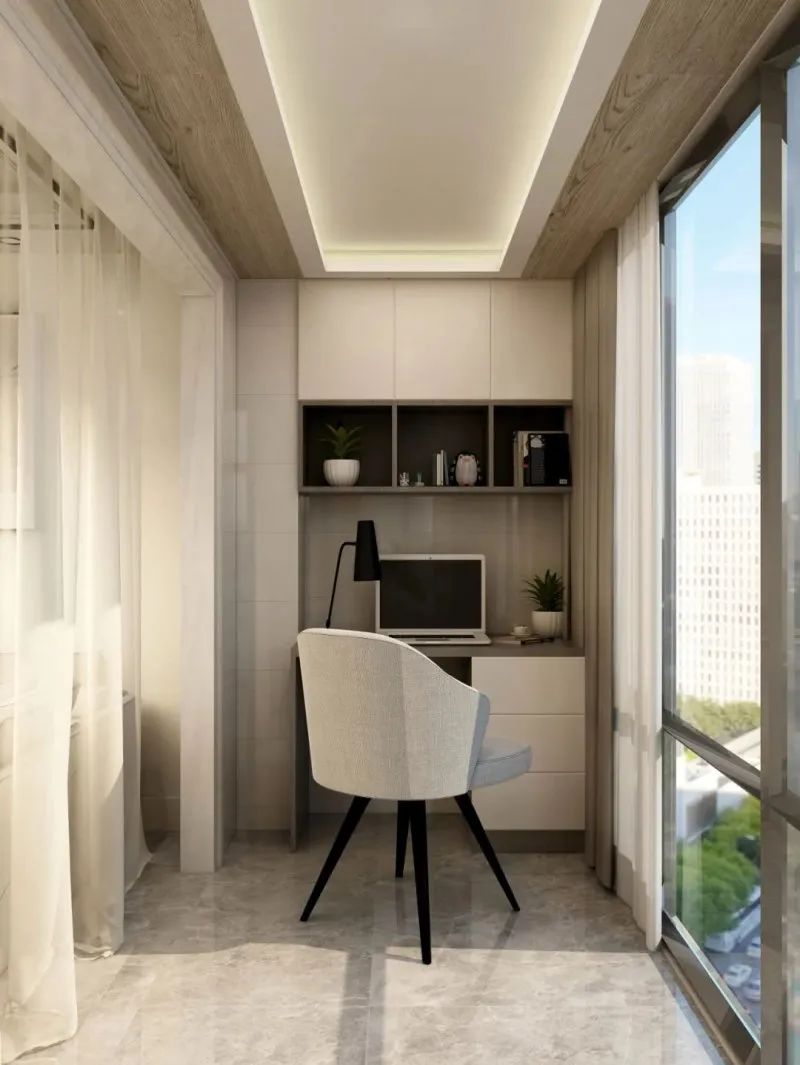 陽臺柜設(shè)計(jì)得好,可以為陽臺增色不少。陽臺上部分做到頂半開放式吊柜,用來收納和展示。下方做書桌臺面,就能成為一個獨(dú)立的辦公區(qū)。陽臺視野寬闊,工作閑暇舉目遠(yuǎn)眺,還可放松身心。