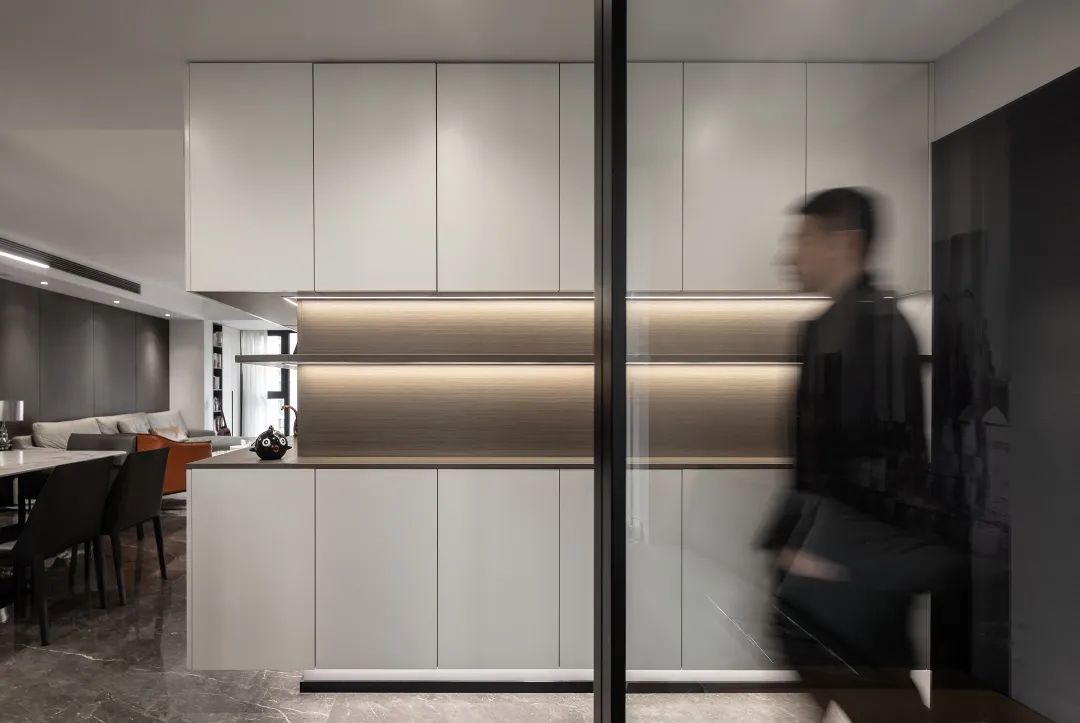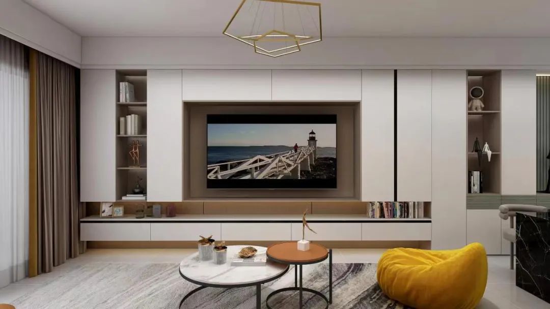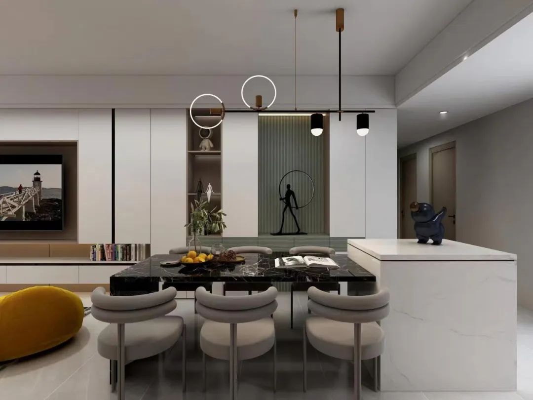 如果覺得客餐廳沒有隔斷,空間區(qū)域劃分不明顯的話,還可以在電視柜與餐邊柜中間設(shè)計(jì)整列開放格或其它方式作為視覺觀感上的區(qū)隔。