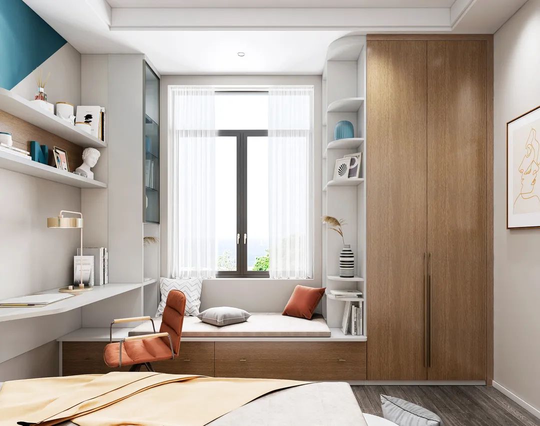 靠窗定制飄窗柜,擴(kuò)大儲物空間,上鋪軟墊,可以坐躺在上面休息,放松身心;靠飄窗柜定制書柜和書桌,又成為了一個學(xué)習(xí)辦公區(qū),沒有獨(dú)立書房的家庭,就能把這里當(dāng)開放式書房了哦~