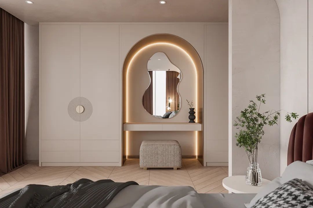 臥室定制到頂式衣柜,大氣簡約,儲物豐富。在轉(zhuǎn)角凹位處延展出同色系梳妝臺,一體化設(shè)計(jì)充分利用了轉(zhuǎn)角空間,在風(fēng)格上看也比單獨(dú)買梳妝臺更和諧統(tǒng)一。