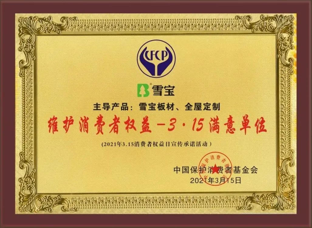 經(jīng)過多輪嚴格的評審與篩選,雪寶家居集團有限公司主導(dǎo)產(chǎn)品雪寶板材、全屋定制品類以優(yōu)異的產(chǎn)品品質(zhì)和良好的消費口碑,被中國保護消費者基金會授予“爭創(chuàng)3•15消費安全品牌承諾單位”!