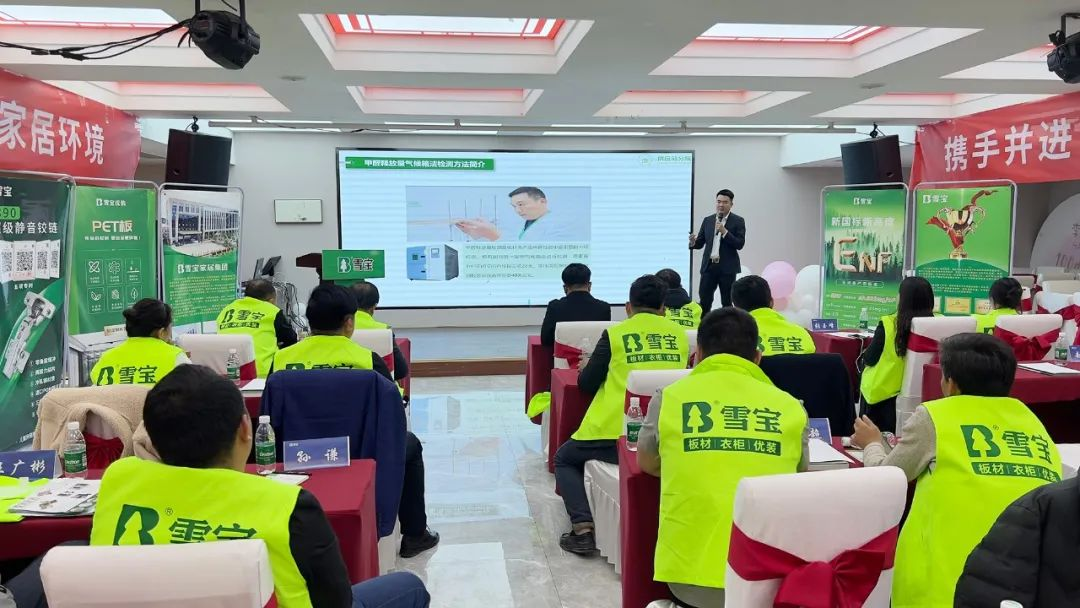 雪寶華北生態(tài)板事業(yè)部山東省區(qū)經理裴禹哲先生現場詳細解讀雪寶ENF級板材產品知識及核心賣點。