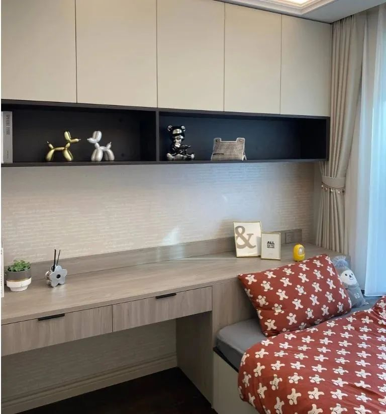 臥室安靜隱蔽,十分適合辦公或者寫作業(yè)。床頭柜+書桌一體化后,不僅可以收納物品,還打造了一個(gè)學(xué)習(xí)區(qū)域,讓臥室空間實(shí)現(xiàn)一房?jī)捎。兩者重合?huì)自然呈現(xiàn)一個(gè)高度差,提升空間的功能性的同時(shí),增加了臥室的靈動(dòng)性。