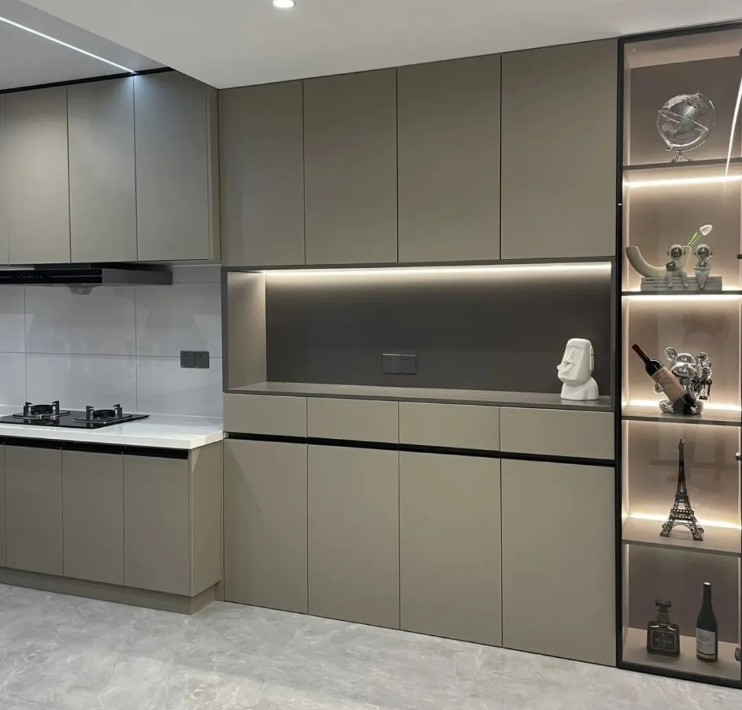 開放式廚房或是獨立西廚區(qū),餐邊柜可以與櫥柜一體定制。餐邊柜的臺面可作廚房臺面的延伸,不僅能夠擴大備餐區(qū)域,緩解廚房收納壓力,同時擁有完整統(tǒng)一的視覺效果,空間更顯開闊。