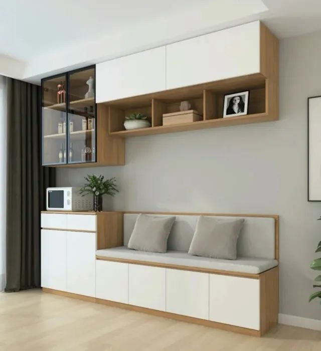 如果餐廳面積不大,想要同時滿足收納和就餐,可以考慮做成餐邊柜+卡座形式。卡座可以根據戶型定制各種功能和造型,同時承擔日常的儲物功能,還能節(jié)省過道空間。