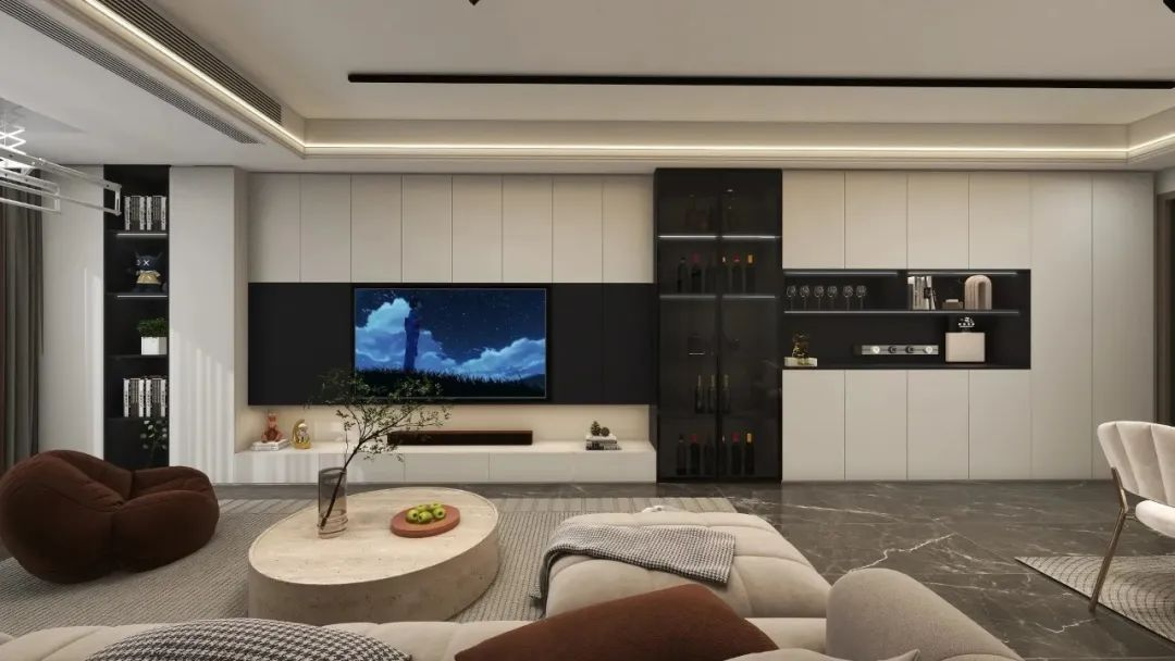 電視柜與餐邊柜結合電視柜+餐邊柜適用于客廳餐廳有相連墻體的情況。餐邊柜+電視柜一體化設計,柜體貫穿兩個區(qū)域,給客廳和餐廳都帶來充足的收納儲物空間。