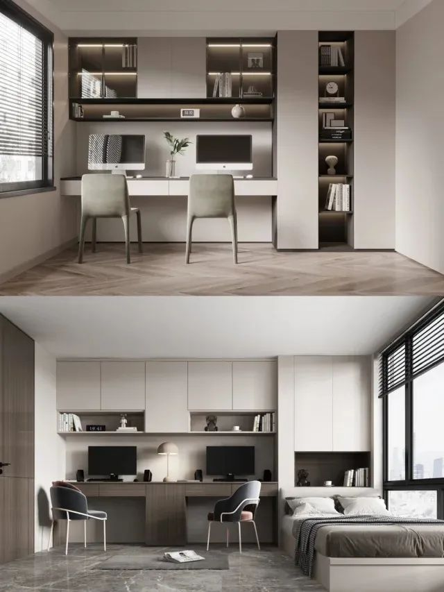 書柜與書桌的功能具有延續(xù)性,將兩者結合,設計成轉角式書桌柜,利用兩個墻面做一體化布局,空間利用更充分,十分適合小臥室。