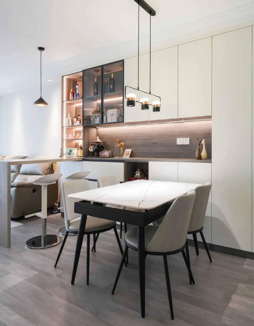“餐邊柜+玄關(guān)柜”一體化設(shè)計(jì),滿足收納的同時(shí),還能避免頂天立地的柜體給門廳帶來壓抑感。