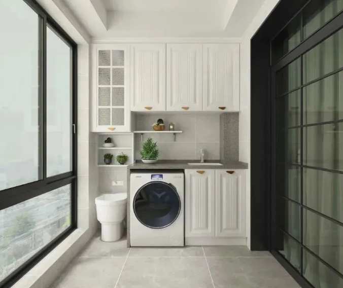 如果能把閑置的陽(yáng)臺(tái)利用起來(lái),定制一個(gè)開(kāi)放式或者是半開(kāi)放式的陽(yáng)臺(tái)柜,多格設(shè)計(jì),要用的和不經(jīng)常用的東西都可以往里面放置,大面積的收納空間把洗衣機(jī)及一切雜亂都藏于柜內(nèi)。如果想要居家時(shí)光也保持美美的氣質(zhì),可以在柜子中間增加一面小巧的梳妝鏡,心情也能變得更好。