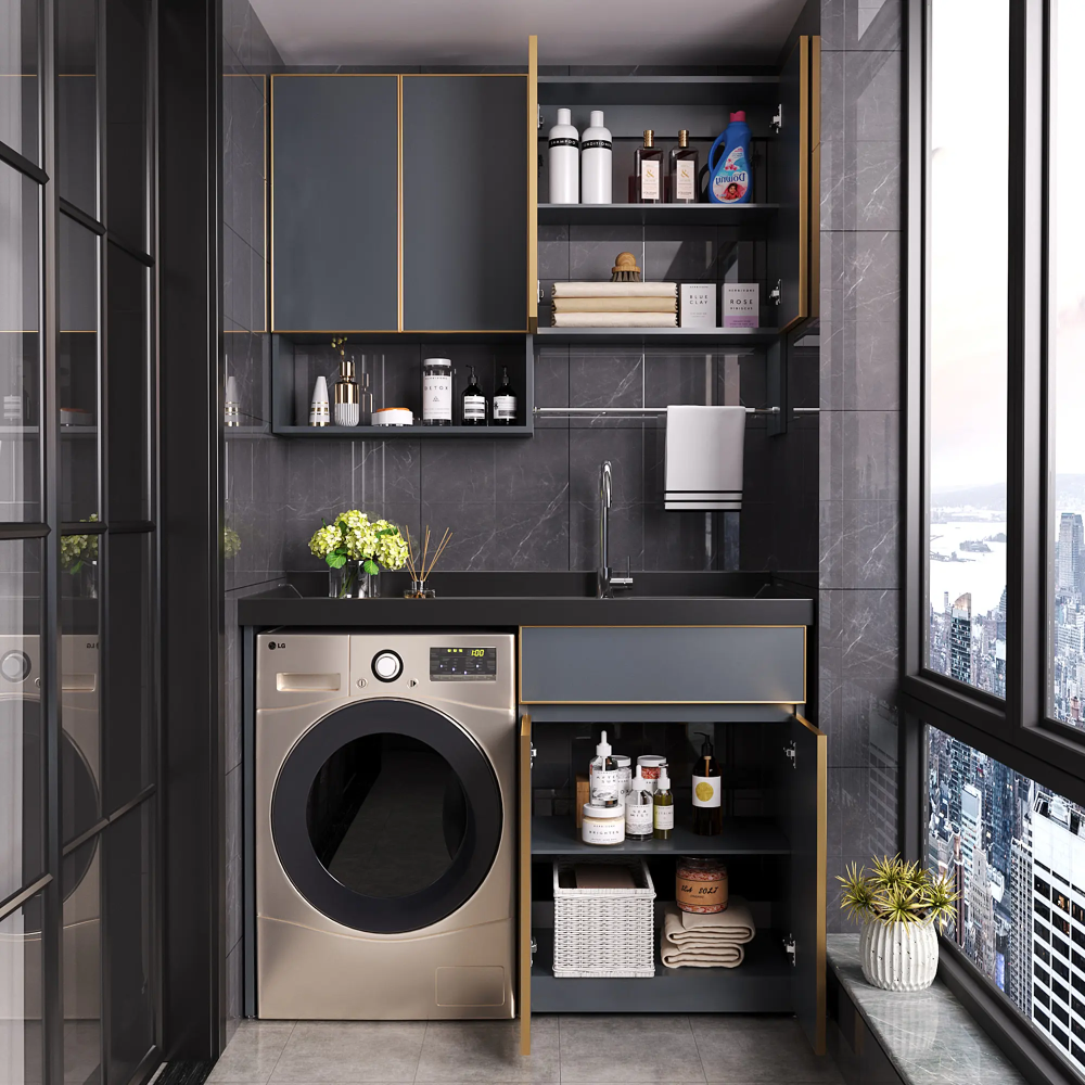 假如手洗衣物不是很多的情況下,備用的洗衣液等物品裝個(gè)吊柜完全能夠滿(mǎn)足收納。