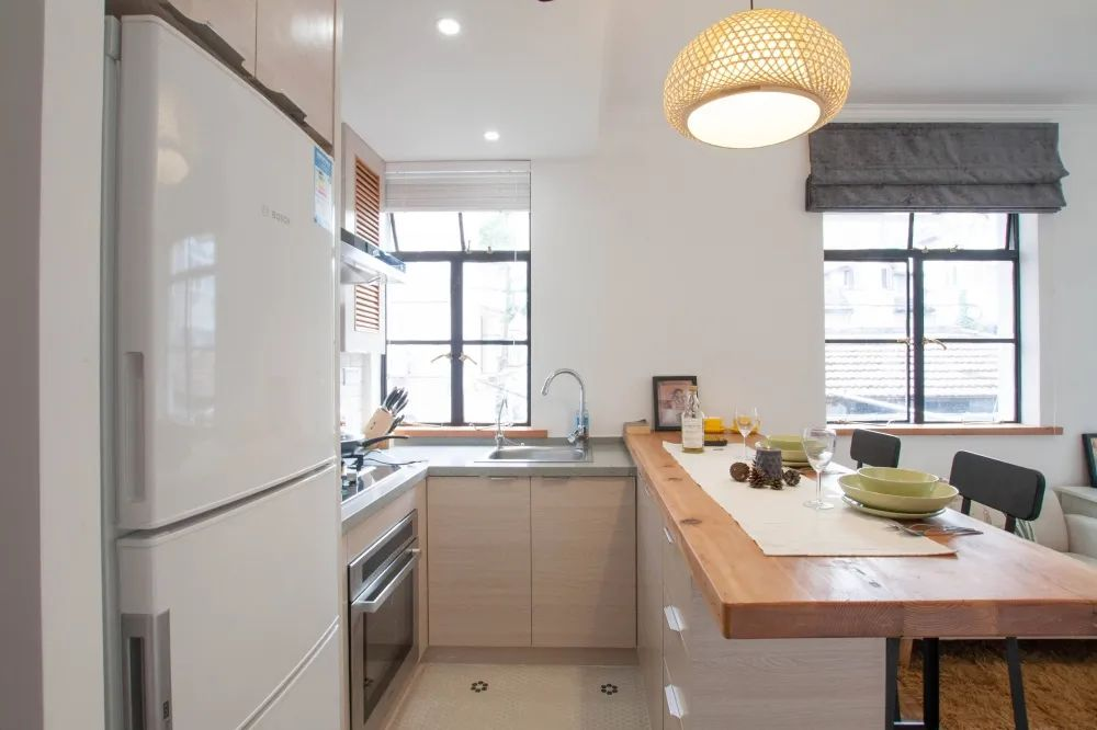 在油煙已經(jīng)不成問題的今天,開放式的廚房采光更足,跟家人溝通也更方便。唯一不好的一點是廚房容易跟客廳混成一塊,總有種在客廳做飯的錯覺。這時,在廚房和客廳之間加入一個吧臺,讓兩者的劃分更明顯,而且吧臺還能當(dāng)備餐桌,一舉兩得。