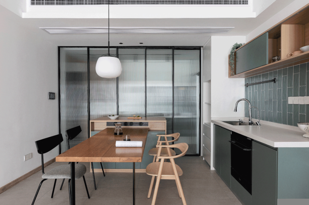 如果喜歡開放式廚房,又實在對油煙等問題有所顧慮。不妨考慮用一扇玻璃門阻斷,擴展空間的同時還能享受開放式廚房的優(yōu)點。
