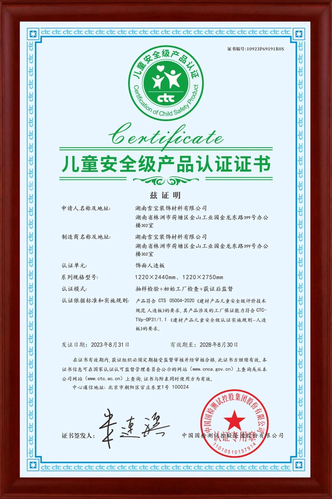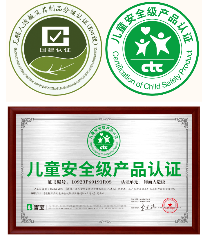 兒童安全級(jí)產(chǎn)品認(rèn)證,以更嚴(yán)苛的環(huán)保標(biāo)準(zhǔn)、更嚴(yán)謹(jǐn)?shù)恼J(rèn)證規(guī)則,旨為保障兒童活動(dòng)場(chǎng)所質(zhì)量及環(huán)境安全健康,也為踐行國家質(zhì)量強(qiáng)國戰(zhàn)略、保證兒童健康生活貢獻(xiàn)力量。本次獲得由中國國檢測(cè)試控股集團(tuán)股份有限公司(CTC)出具的兒童安全級(jí)產(chǎn)品認(rèn)證證書顯示:產(chǎn)品符合 CTS 05004-2020《建材產(chǎn)品兒童安全級(jí)評(píng)價(jià)技術(shù)規(guī)范人造板》的要求,進(jìn)一步有力證明了雪寶板材飾面人造板材系列產(chǎn)品的健康和環(huán)保性,同時(shí),雪寶板材產(chǎn)品環(huán)保性、安全性得到國家官方權(quán)威機(jī)構(gòu)的認(rèn)證,也是對(duì)我們致力拔高行業(yè)的產(chǎn)品環(huán)保水平新高度的認(rèn)可和肯定!