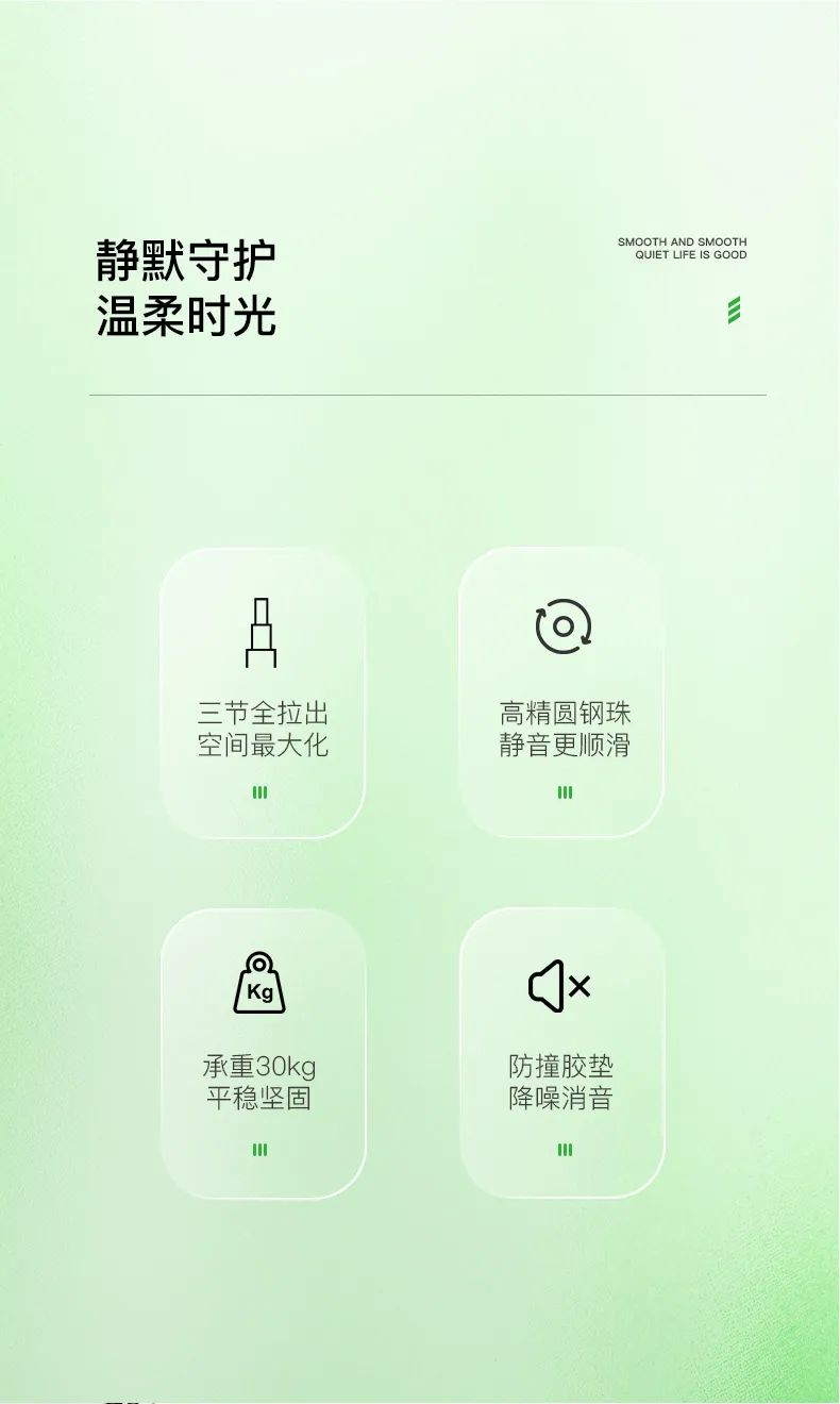 滑軌抽屜在現(xiàn)代家具中是必不可少的組成部分,而在整個抽屜的設(shè)計中,小小的滑軌對整個抽屜的質(zhì)量可有著舉足輕重的影響,那些大大小小的抽屜能否自由順滑地推拉、承重如何,全靠滑軌的支撐。雪寶4515緩沖(反彈)三節(jié)軌→靜默守護居家生活的溫柔時光!
