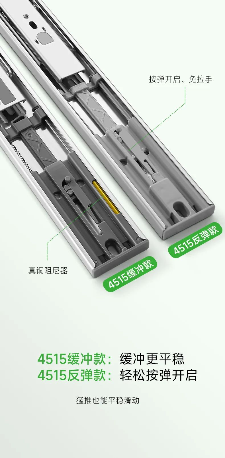 4515緩沖款:緩沖更平穩(wěn)4515反彈款:輕松按彈開啟無論是緩沖款還是反彈款,都具備下述優(yōu)勢:1、上海寶鋼原材料,高光封閉電鍍,抗銹能力極強;2、加厚三節(jié)鋼珠抽屜滑軌,標(biāo)準(zhǔn)厚度,經(jīng)久耐用;3、進口高精圓鋼珠,平穩(wěn)、順暢,開合更靜音;4、三節(jié)軌全拉出,抽屜一覽無余,空間最大化;5、承重30kg,平穩(wěn)堅固;6、防撞膠墊,降噪消音;
