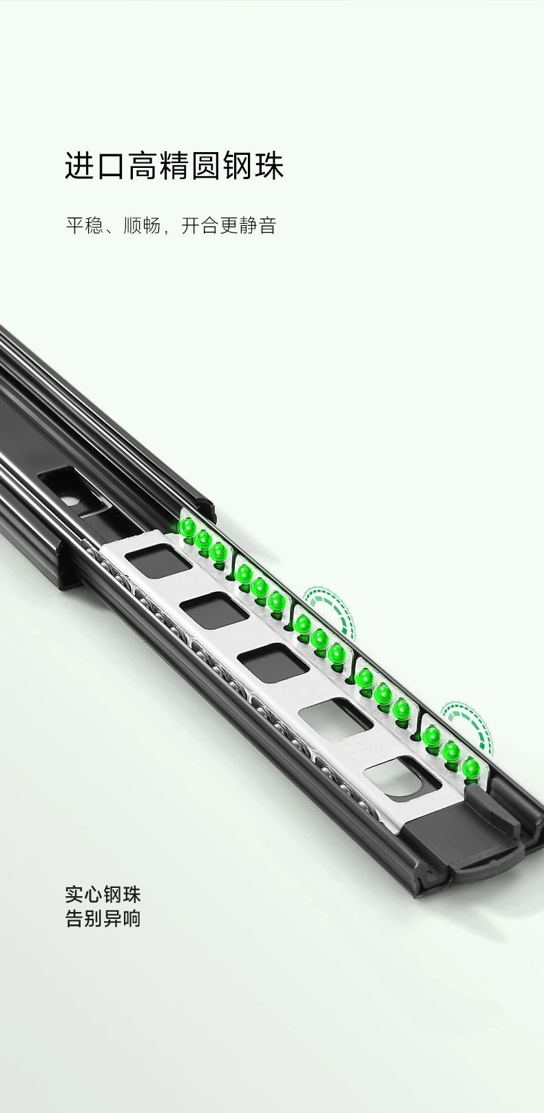 抽屜在家具中的使用很關(guān)鍵,對于抽屜而言,滑軌就是抽屜的“心臟”。于家居收納中有著無與倫比的作用,讓空間在無序中建立有序。而抽屜的使用體驗,絕大程度上取決于滑軌。開合是否能順滑、能抽拉到什么程度、承重如何、會不會翻傾等問題,都跟滑軌有關(guān)系,因此選擇一個品質(zhì)好的滑軌很重要。雪寶4512黑色鋼珠三節(jié)滑軌,精工設(shè)計,內(nèi)置鋼珠,穩(wěn)定性強,全程順滑到底。三節(jié)全拉出設(shè)計,抽屜空間一覽無余,物品收納整齊有序,取物更輕松。表面電鍍工藝,抗腐蝕,耐磨損,久用如新,無需頻繁更換?燎笃焚|(zhì)細(xì)節(jié),讓每一次推拉都是一種享受!